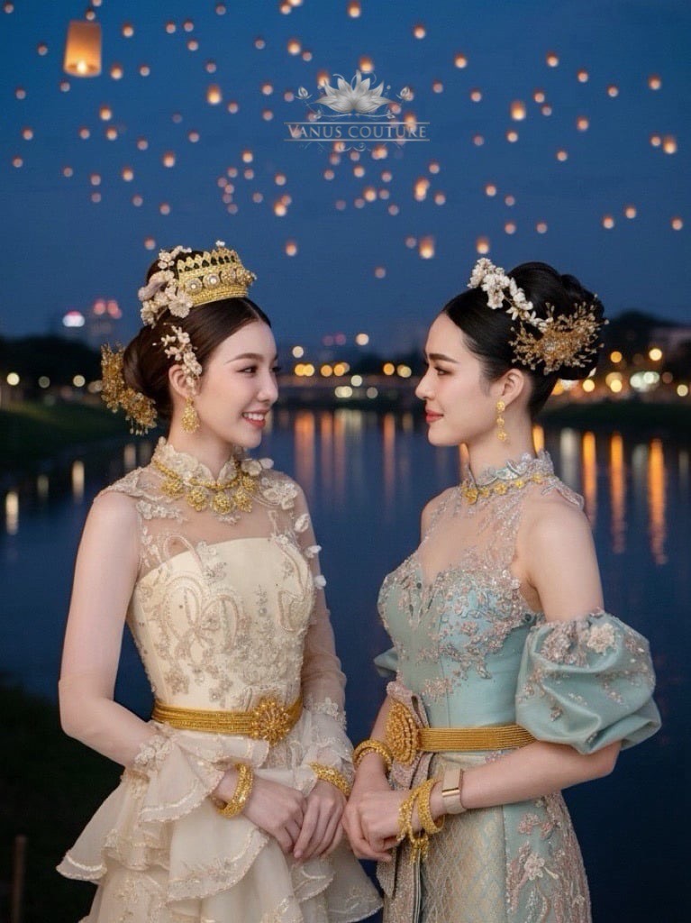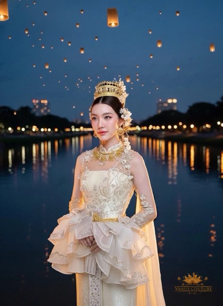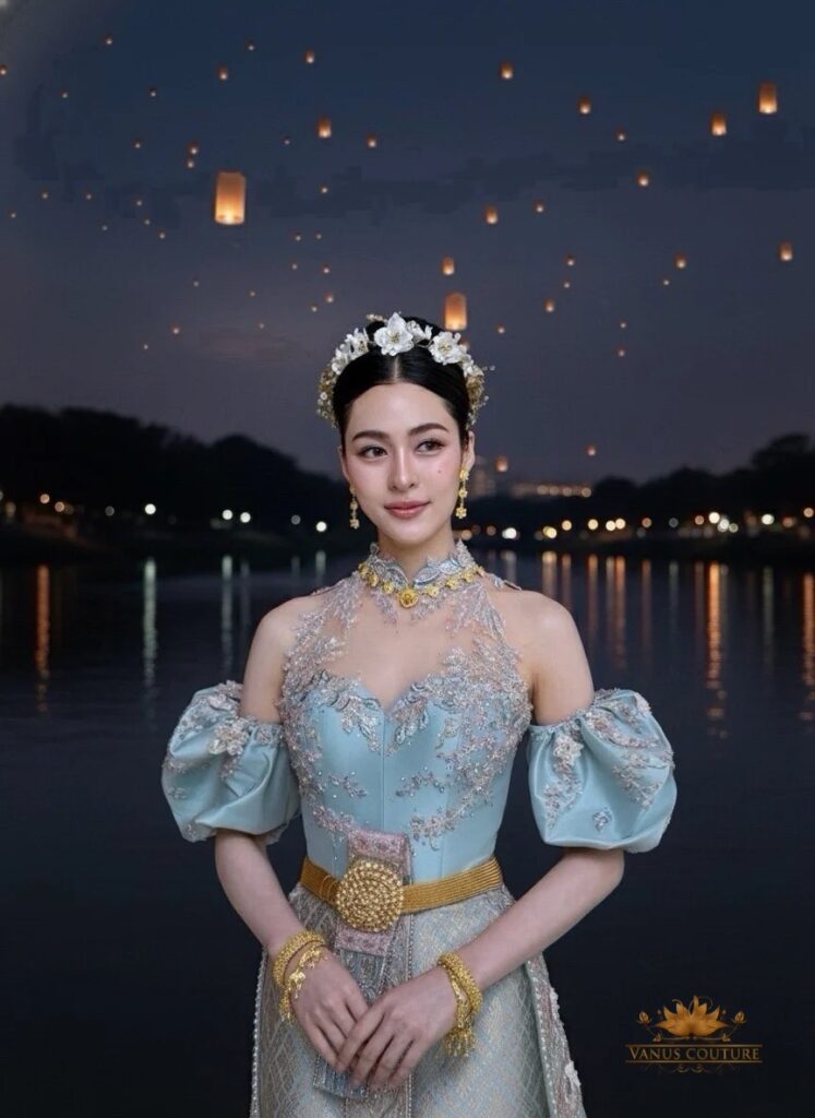 ออม มาในลุคชุดโทนครีมทองแชมเปญ เปล่งประกายดั่งแสงเทียนในค่ำคืนยี่เป็ง เสริมความหรูหราด้วยแขนระบายชั้นลูกไม้ฝรั่งเศส และลายปักดอกบุษบาประดับไข่มุกละเอียดประดุจกลีบดอกไม้ยามต้องแสงไฟระยิบของโคมลอย