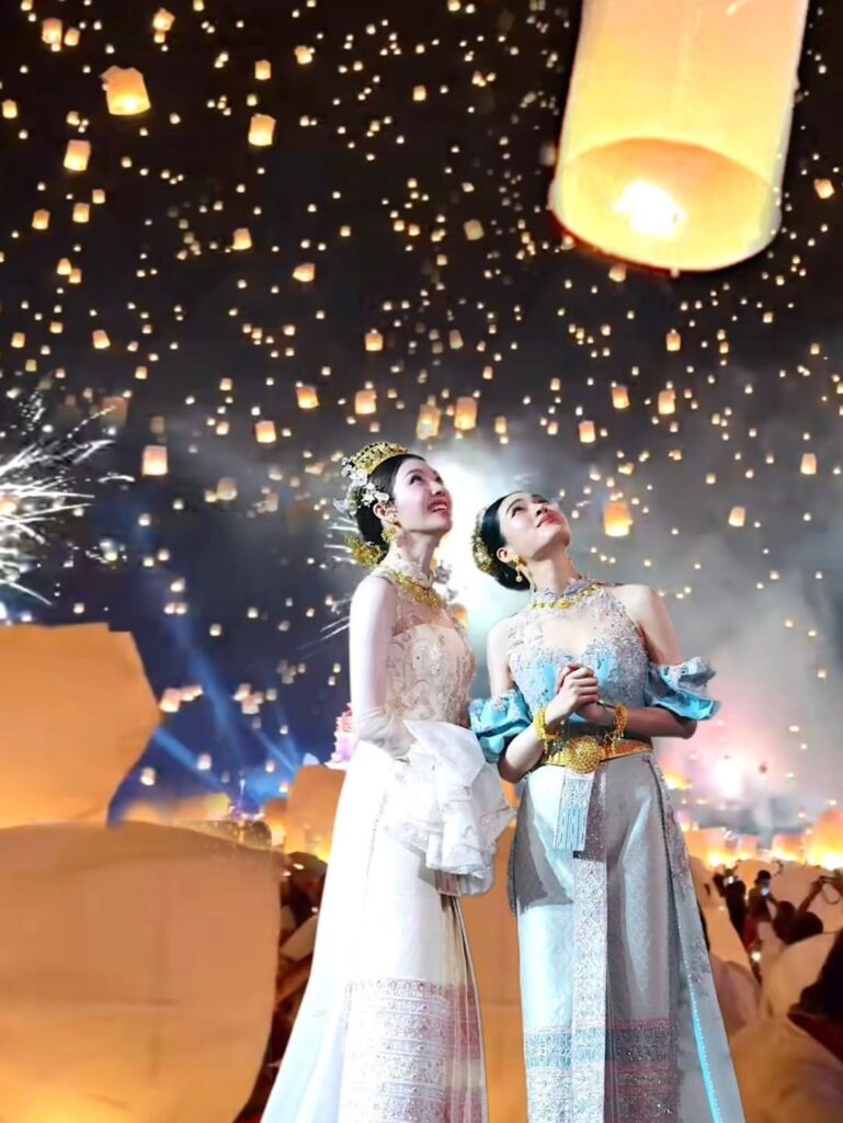 หลิงหลิง มาในลุคชุดโทนชมพู–ครีม อ่อนหวาน หรูหรา และละเมียดละไม สะท้อนประกายอิ่มเอมราวแสงโคมดวงน้อยที่ลอยเรียงรายบนท้องฟ้า ดีเทลลายทอไทยและงานปักละเอียด ถ่ายทอดความอ่อนโยนและความงดงามของหญิงสาวในวันพิเศษได้อย่างสมบูรณ์