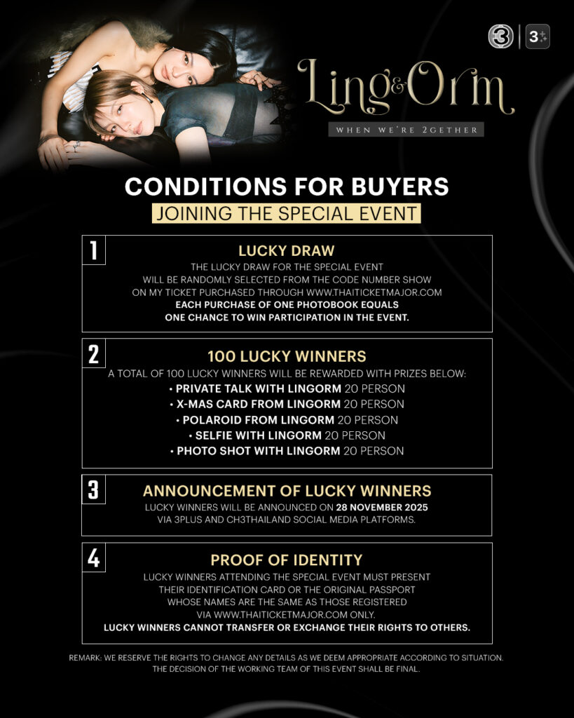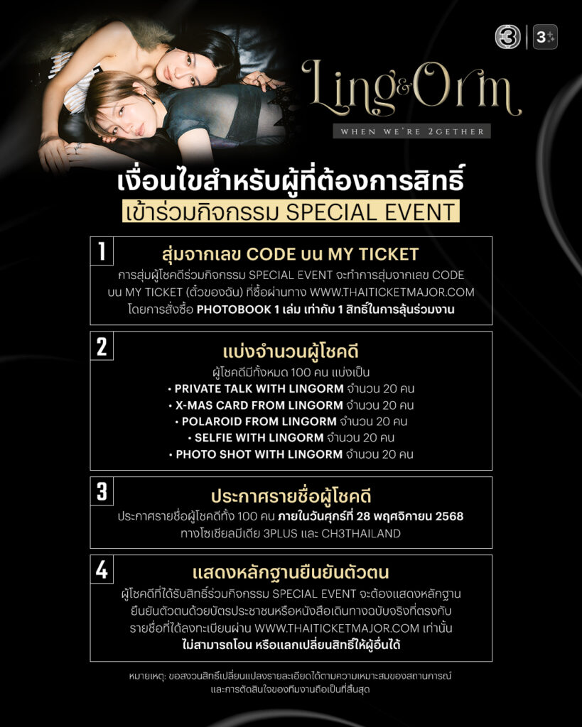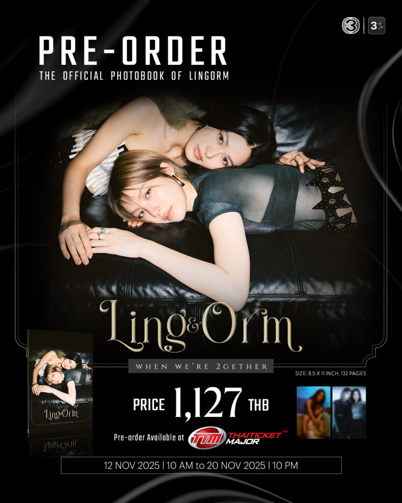 เตรียมพบกับอีกหนึ่งบทบันทึกแห่งความทรงจำของสองสาวสุดฮอต “หลิงหลิง คอง” และ “ออม กรณ์นภัส” กับโฟโต้บุ๊กเล่มใหม่ “LING & ORM WHEN WE’RE 2GETHER” The Official Photobook of LINGORM ที่จะพาแฟน ๆ หนีไปสู่โลกของความรู้สึกและภาพจำผ่านคอนเซ็ปต์ “RUN AWAY WITH ONE’S LOVER” การหลบหนีมากับคนรักแล้วสร้างพื้นที่ส่วนตัว เพื่อสร้างความเป็นอิสระและเป็นตัวของตัวเอง โดยภาพถ่ายภายในเล่มถ่ายทอดอารมณ์ในสไตล์ Modern, Arts และ Grunge ที่สะท้อนเสน่ห์เฉพาะตัวของคู่ “หลิง-ออม” แบบที่ไม่มีใครเคยเห็นในราคา 1,127 บาท เตรียมจับจองพรีออเดอร์ได้แล้วตั้งแต่วันนี้ – 20พฤศจิกายน 2568ผ่านทางเว็บไซต์ www.thaiticketmajor.com พิเศษสุด! ทุกการสั่งซื้อจะได้รับสิทธิ์ลุ้นร่วมกิจกรรม SPECIAL EVENT กับ “หลิง-ออม” ในวันที่ 3 ธันวาคม 2568 โดยโฟโต้บุ๊กจะจัดส่งตั้งแต่วันที่ 20 ธันวาคม 2568 เป็นต้นไป รายละเอียดเพิ่มเติมติดตามได้ทาง Ch3Thailand และ 3Plus