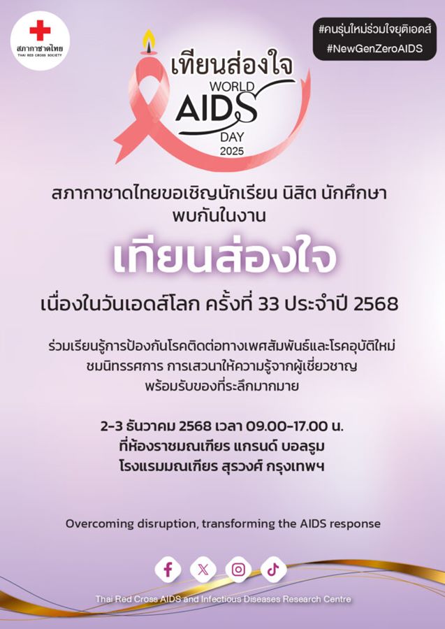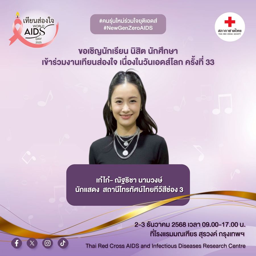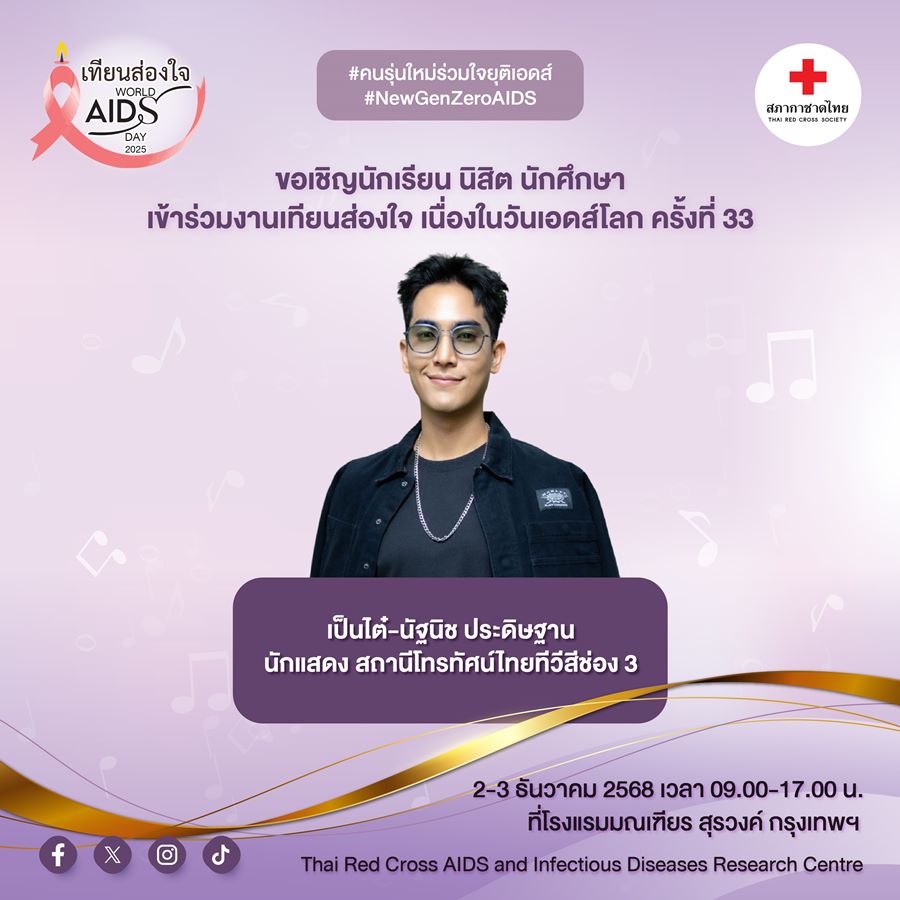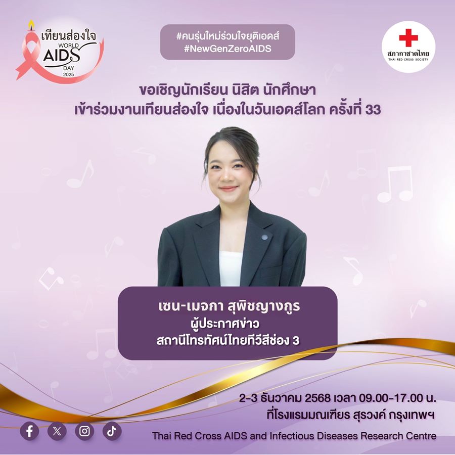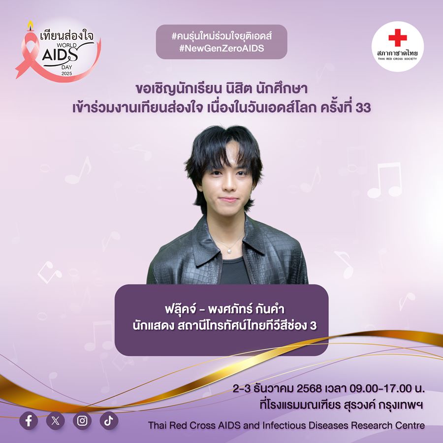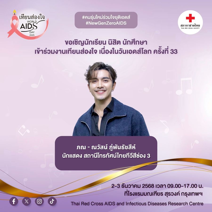 นักแสดงช่อง 3 ร่วมด้วย ภณ-ณวัสน์ ภู่พันธัชสีห์, เก๋ไก๋- ณัฐธิชา นามวงษ์, เป็นไต๋-นัฐนิช ประดิษฐาน, ฟลุ๊คจ์ – พงศภัทร์ กันคำ พร้อมด้วย เซน-เมจกา สุพิชญางกูร ผู้ประกาศข่าวช่อง 3 ร่วมถ่ายภาพโปสเตอร์และสปอตวิดีโอประชาสัมพันธ์เชิญชวนเยาวชนร่วมงาน “เทียนส่องใจ เนื่องในวันเอดส์โลก” ครั้งที่ 33 ประจำปี 2568 ระหว่างวันที่ 2-3 ธันวาคม 2568 เวลา 09.00-17.00 น. ณ ห้องราชมณเฑียร แกรนด์ บอลรูม โรงแรมมณเฑียร สุรวงศ์ กรุงเทพฯ ภายใต้แนวคิด “คนรุ่นใหม่ร่วมใจยุติเอดส์ : New Gen Zero AIDS” โดยมีวัตถุประสงค์เพื่อสร้างความตระหนักรู้ในการป้องกันเชื้อเอชไอวี/เอดส์ ร่วมกันรณรงค์ลดจำนวนผู้ติดเชื้อ ลดการตีตรา และไม่เลือกปฏิบัติในสังคม ตลอดจนส่งเสริมให้ประชาชนมีความรู้ความเข้าใจในการป้องกันโรคเอดส์และโรคติดต่อทางเพศสัมพันธ์ที่ถูกต้อง รวมถึงโรคติดต่อทางเพศสัมพันธ์ และโรคอุบัติใหม่ เช่น ฝีดาษวานร ที่ยังคงมีการแพร่ระบาดในประเทศไทย โดยภายในงานมีกิจกรรมการเรียนรู้การป้องกันโรคติดต่อทางเพศสัมพันธ์และโรคอุบัติใหม่ ชมนิทรรศการ การเสวนาให้ความรู้จากผู้เชี่ยวชาญ รับของที่ระลึกมากมาย และรับเกียรติบัตร สามารถลงทะเบียนผ่านแอปพลิเคชัน “อาสาสมัครกาชาด” ไปที่ “งานทั่วไป” เลือก “กิจกรรมเทียนส่องใจ เนื่องในวันเอดส์โลก ครั้งที่ 33” แล้วเลือก “จอง” ติดต่อสอบถามคุณสายทอง ศรีภิญโญ โทร. 08 9111 7780 สำนักงานยุวกาชาดและอาสาสมัครกาชาด สภากาชาดไทย หรือ walk in สอบถามได้ที่เฟซบุ๊กเพจ