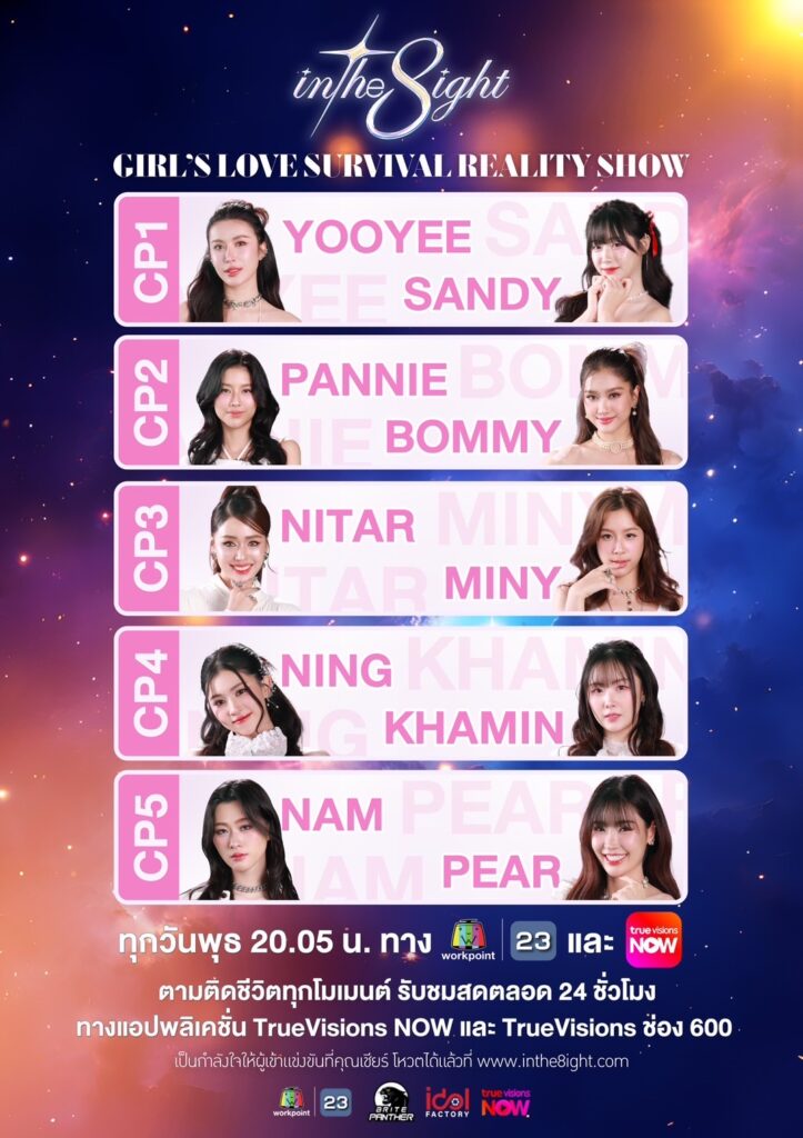แฟน ๆ ร่วมโหวตและให้กำลังใจผู้เข้าแข่งขัน 10 คนสุดท้าย 5 คู่ CP1 ยู่ยี่-แซนดี้ , CP2 แพนนี่-บอมมี่, CP3 นิต้า-มินนี่, CP4 นิ้ง-ขมิ้น, CP5 น้ำ-แพร ได้ทาง https://www.inthe8ight.com ติดตามชมรายการ “In The 8ight” ได้ทุกวันพุธ เวลา 20.05 น. ทางช่องเวิร์คพอยท์ 23 และแอปพลิเคชั่น TrueVisions NOW และร่วมเกาะติดชีวิตทุกโมเมนต์สดตลอด 24 ชั่วโมง ทางแอปพลิเคชั่น TrueVisions NOW และ TrueVisions ช่อง 600