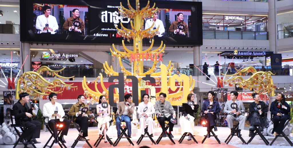 ภายในงานแถลงข่าว Netflix ได้เนรมิตลานซีคอนสแควร์ ฮอลล์ ให้กลายเป็น “สาธุแฟร์” งานมหาบุญกุศลสุดอลังการ พร้อมต้นโพธิ์ยักษ์ซึ่งถอดแบบมาจากเมกะโปรเจกต์บุญในซีรีส์ตั้งตระหง่านอยู่ตรงใจกลาง เปิดโอกาสให้สาธุชนเติมพลังบุญกับกิจกรรมมากมาย ทั้งการลอดท้องเสือสะเดาะเคราะห์ต่อชะตา มุมขอพรด้านการงาน การเงิน และความรัก พร้อมรับใบโพธิ์อธิษฐานส่งตรงจากวัดหนองขาล เพื่อเขียนคำอธิษฐานแล้วไปแขวนบนต้นโพธิ์ยักษ์กลางลาน โดยมีนักแสดงมาร่วมส่งแรงศรัทธามากมายทั้ง เจมส์–ธีรดนย์ ศุภพันธุ์ภิญโญ, พีช–พชร จิราธิวัฒน์, แอลลี่–อชิรญา นิติพน, โดนัท–มนัสนันท์ พันเลิศวงศ์สกุล, ปั๊บ–พัฒน์ชัย ภักดีสู่สุข และ เพชร–เผ่าเพชร เจริญสุข พร้อมด้วยผู้กำกับ วรรธนพงศ์ วงศ์วรรณ เพื่อร่วมพูดคุยถึงพัฒนาการของตัวละคร รวมถึงเบื้องหลังที่น่าสนใจของการถ่ายทำซีรีส์ สาธุ ๒