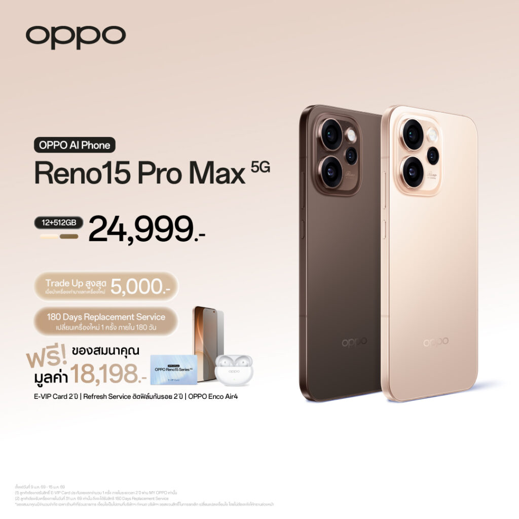 OPPO Reno15 Series 5G สมาร์ตโฟนเพื่อนซี้ เทรนดี้ทุกช็อต ยกระดับมาตรฐานการสร้างสรรค์คอนเทนต์ด้วยกล้องเซลฟี่มุมกว้างพิเศษในทุกรุ่น ความละเอียด 50MP มาพร้อมระยะใหม่ 0.6x กว้างที่สุดในอุตสาหกรรม ที่ให้มุมมองภาพกว้างถึง 100 องศา ช่วยเก็บภาพบรรยากาศและภาพกลุ่มกับเพื่อน ๆ ได้ครบจบในเฟรมเดียว ผสานพลัง AI Portrait Glow ปรับผิวสวยสว่างใสเป็นธรรมชาติ และฟีเจอร์ Popout มิติใหม่แห่งการตัดต่อคอลลาจให้สนุกมากยิ่งขึ้น โดยเฉพาะในรุ่น OPPO Reno15 5G และรุ่นโปรอย่าง OPPO Reno15 Pro 5G และ OPPO Reno15 Pro Max 5G ที่ยกระดับการถ่ายบุคคลด้วยกล้องพอร์ตเทรตซูมได้ 3.5x มีสไตล์ ให้ภาพมีมิติ ไวบ์ดี ไม่ซ้ำใคร ส่วนสาย Vlogger ต้องถูกใจ OPPO Reno15 Pro 5G และ OPPO Reno15 Pro Max 5G ที่รองรับการบันทึกวิดีโอ 4K HDR กันสั่นครอบคลุมทุกระยะโฟกัส พร้อมกับกล้องหลักคมชัดพิเศษ 200MP ให้เหล่าครีเอเตอร์สร้างสรรค์ผลงานภาพถ่ายและวิดีโอได้เหมือนมืออาชีพ บนดีไซน์ตัวเครื่องสวย ทันสมัย พร้อมนำเทรนด์ด้วยฝาหลังแสงออโรร่าพลิ้วไหว เหมือนกับแสงเหนือแสงใต้บนตัวเครื่องบางเฉียบ จับถือถนัดมือ ขับเคลื่อนด้วยระบบปฏิบัติการใหม่ ColorOS 16 ให้ใช้งานได้อย่างลื่นไหลและชาญฉลาดยิ่งขึ้น พร้อมเพิ่มประสิทธิภาพการใช้งานด้วย AI Mind Space และ AI Super ToolBox ที่ช่วยให้การทำงานและชีวิตประจำวันสะดวกสบายมากยิ่งขึ้น พร้อมรองรับการเชื่อมต่อที่รวดเร็วด้วย AI LinkBoost 3.0 และ AI HyperBoost 2.0 เพื่อการเล่นเกมแบบไม่มีสะดุด และมาพร้อมกับแบตเตอรี่ขนาดใหญ่สูงสุด 7000mAh และระบบชาร์จไว 80W SUPERVOOC พร้อมรองรับการชาร์จไร้สาย 50W AIRVOOC