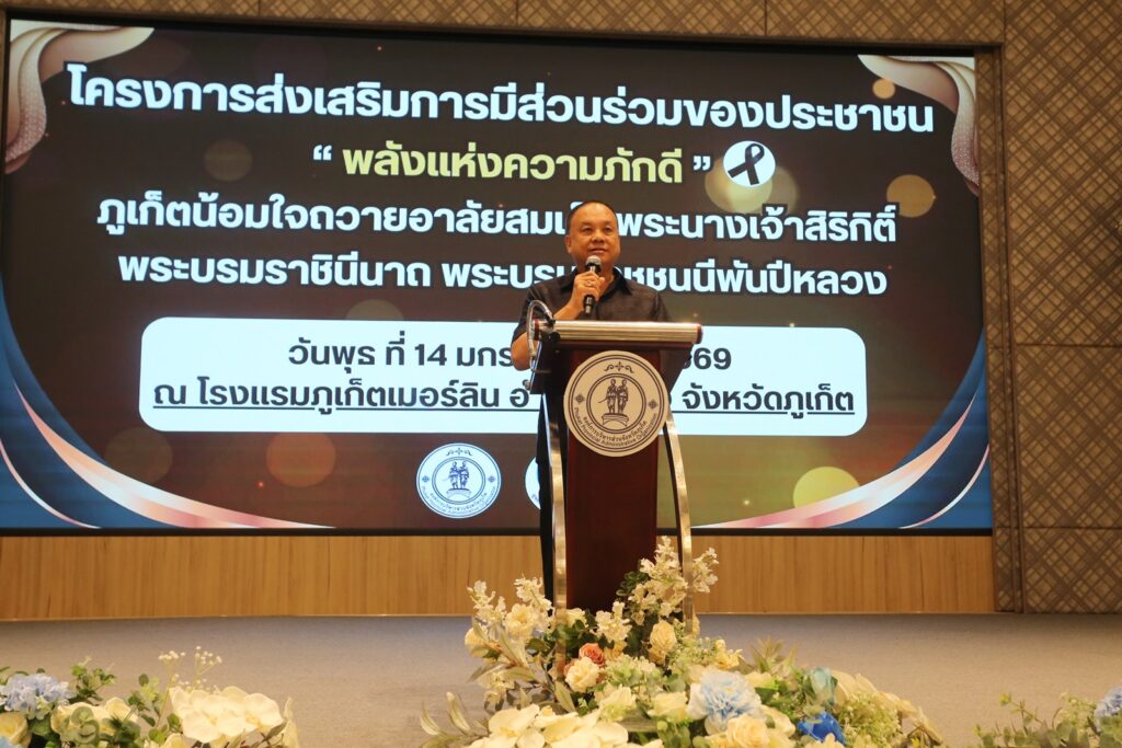 เมื่อวันที่ 14 มกราคม 2569 เวลา 09.00 น. ณ โรงแรมภูเก็ตเมอร์ลิน นายเรวัต อารีรอบ นายกองค์การบริหารส่วนจังหวัดภูเก็ต เป็นประธานในพิธีเปิดโครงการส่งเสริมการมีส่วนร่วมของประชาชน “พลังแห่งความภักดี” ภูเก็ตน้อมใจถวายอาลัยสมเด็จพระนางเจ้าสิริกิติ์ พระบรมราชินีนาถ พระบรมราชชนนีพันปีหลวง ประจำปีงบประมาณ 2569 รุ่นที่ 2 โดยมี นายอัครวัฒน์ ศิริธัญญ์ธนากร ปลัด อบจ.ภูเก็ต กล่าวรายงาน