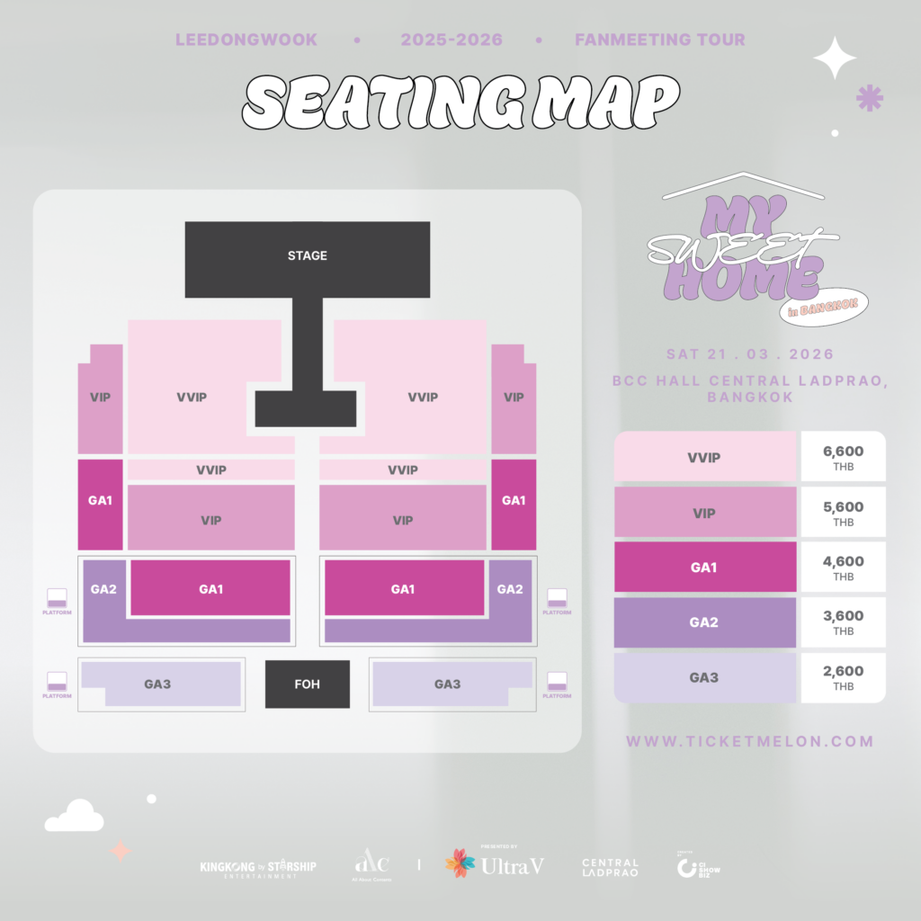 ส่วนผังที่นั่ง และราคาบัตร แบ่งออกเป็น 5 โซน ได้แก่ VVIP ราคา 6,600 บาท / VIP ราคา 5,600 บาท/ GA1 ราคา 4,600 บาท / GA2 ราคา 3,600 บาท และ GA3 ราคา 2,600 บาท ในราคาที่คุ้มค่าเพื่อตอบโจทย์ทุกระดับความใกล้ชิด ให้neoheeไทยได้ดื่มด่ำกับความฟิน ภายใต้คอนเซ็ปต์ “My Sweet Home” อย่างเต็มที่ พร้อมกับสิทธิพิเศษมากมายแบบอัดแน่น เช่น Mini Talk, Hi-Bye, Hi-Touch, Group Photo, Signed Polaroid, Signed Poster, Photo Card และ Official Poster