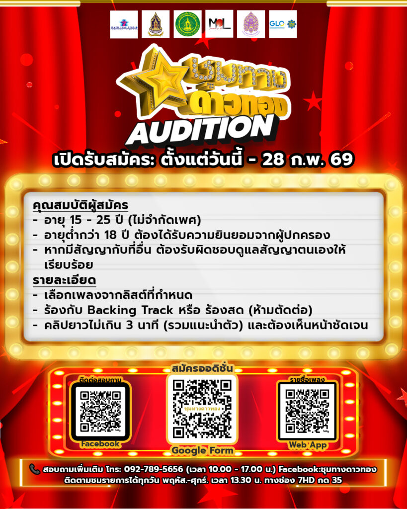 โปรฯความพิเศษยังไม่หมด! ซีซั่นนึ้ยังคงเข้มข้นส่วนซีซั่นใหม่ก็เปิดให้คนมีฝันมีไฟ อายุระหว่าง 15-25 ปี สามารถส่งคลิปมาออดิชั่นกันออนไลน์ โดยส่งมาได้ตั้งแต่วันนี้จนถึง 28 กุมภาพันธ์ 2569 พร้อมเช็ครายชื่อเพลงที่ใช้ประกวดได้ที่ https://docs.google.com/spreadsheets/d/1FQzG1jy9z3ZU8ocM81K7qRPnPMa8eGCA/edit?usp=sharing&ouid=117970526722556822050&rtpof=true&sd=true และสอบถามรายละเอียดเพิ่มเติมที่ โทร.092-789-5656