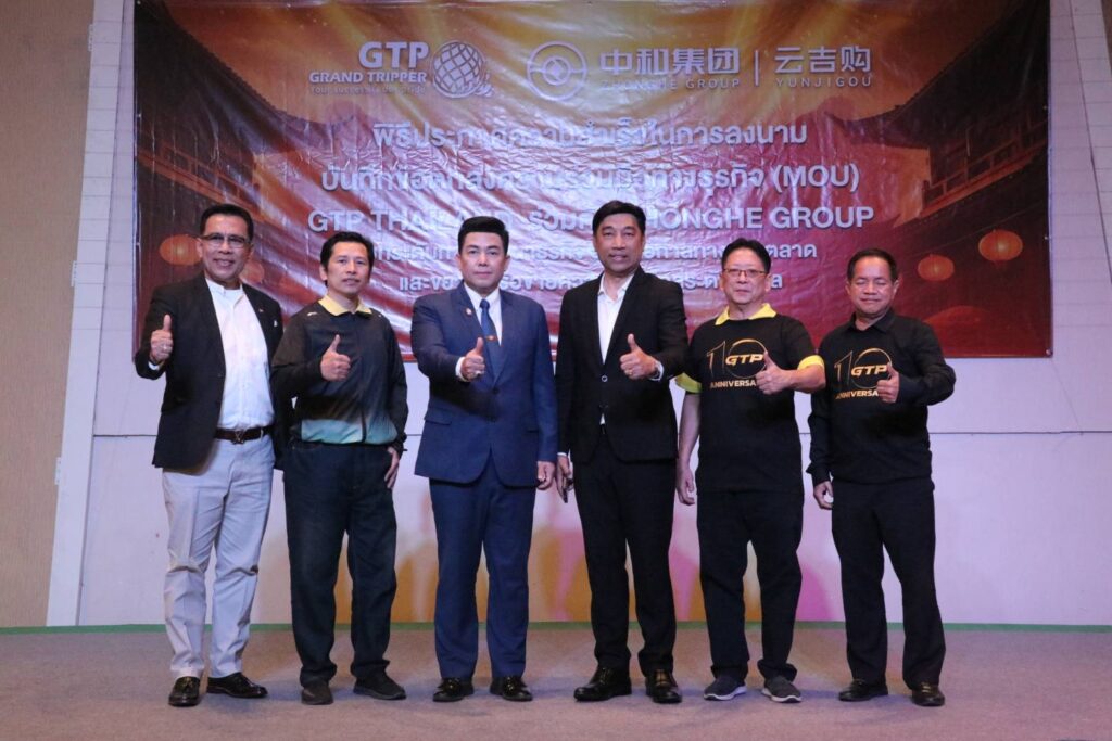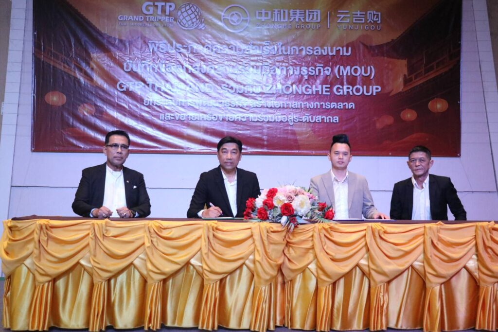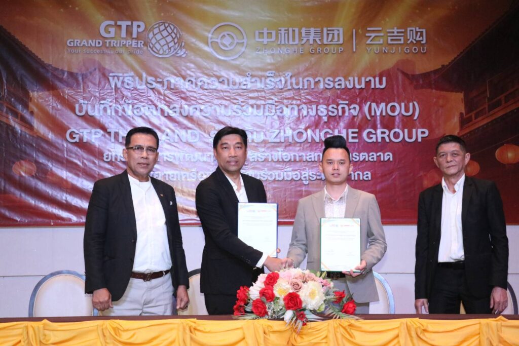 บันทึกข้อตกลงความร่วมมือทางธุรกิจ (MOU) ระหว่างบริษัทแกรนด์ทริปเปอร์ จำกัด (GTP) ร่วมกับ มิสเตอร์ เฮอเจี้ยน ประธานบริษัทจงเฮอกรุ๊ป (ZHONEHE GROUP) ทั้งยังบริหารบริษัท (YUNJIGOU) จากสาธารณรัฐประชาชนจีน