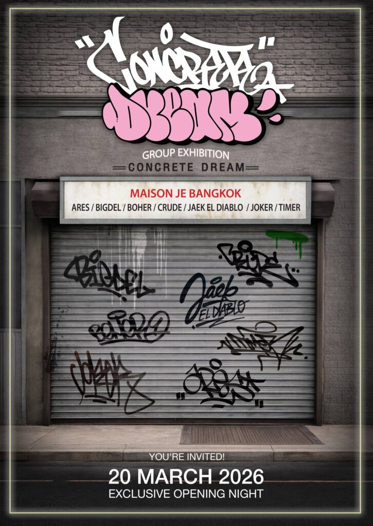 นิทรรศการ Concrete Dream จัดแสดงระหว่างวันที่ 20 มีนาคม – 3 พฤษภาคม 2569 ณ Maison JE Bangkok ถนนสุรวงศ์ แขวงสี่พระยา เขตบางรัก กรุงเทพฯ เปิดให้เข้าชมทุกวันอังคาร – อาทิตย์ เวลา 11.00 – 19.00 น. (ปิดวันจันทร์) ติดตามความเคลื่อนไหวได้ที่ Facebook: Maison JE Bangkok หรือโทร. 096 221 1646