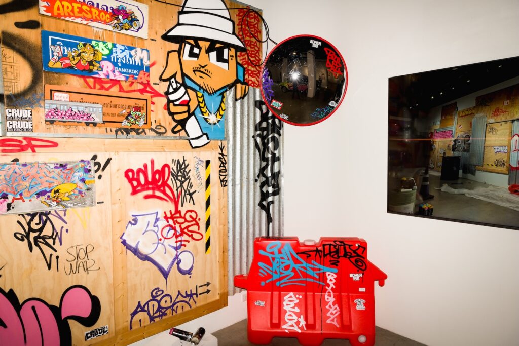 จากชั้น 1 สู่ชั้น 2 ของ Maison JE Bangkok สถานที่จัดแสดงนิทรรศการ คุณจะสัมผัสได้ถึงเส้นทางชีวิตที่มาบรรจบกันของศิลปินทั้ง 7 คน จากการเผชิญโลกภายนอก สู่การทำความเข้าใจโลกภายในอย่างเงียบงัน จากแรงกดดันของสังคม สู่การค้นพบคุณค่าและเป้าหมายในชีวิต Concrete Dream ไม่ได้นิยามความหมายของกราฟฟิตี ไม่ได้โรแมนติไซส์ในวัฒนธรรมสตรีท หากแต่เพียงถ่ายทอด “ประสบการณ์ชีวิตในเมือง” ผ่านกราฟฟิตีและมุมมองของศิลปิน ให้เป็นพื้นที่ที่เปิดรับทุกความรู้สึก ทั้งยังเปิดกว้างเพียงพอให้ผู้ชมปลดปล่อยจินตนาการ บางผลงานอาจชวนให้นึกถึงประสบการณ์ร่วม เพื่อเข้าถึงการเติบโตภายในที่เปลี่ยนแปลงไปตามกาลเวลา