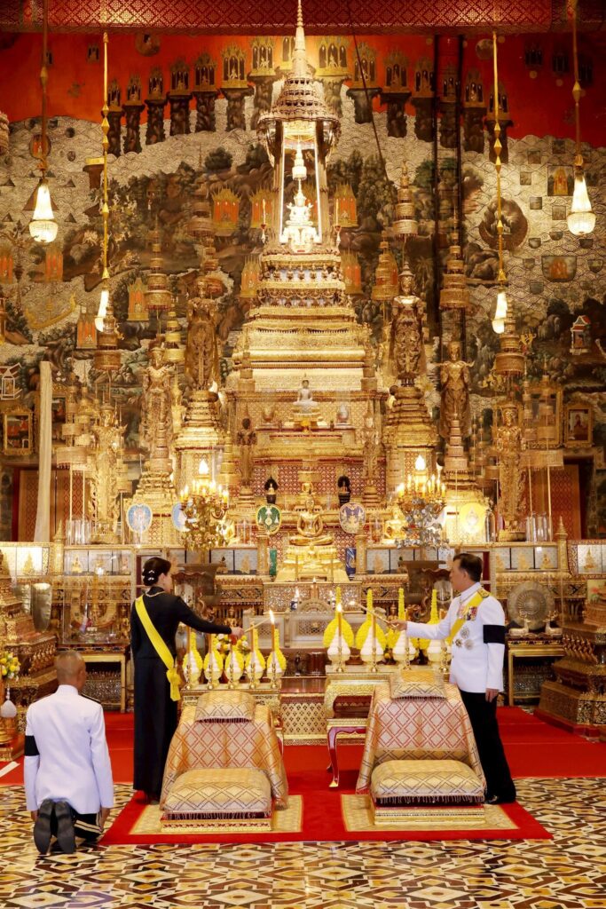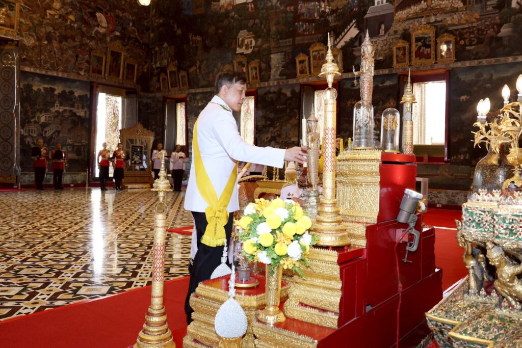 วันนี้ ๖ เมษายน ๒๕๖๙ เวลา ๑๗.๔๗ น. พระบาทสมเด็จพระเจ้าอยู่หัว และสมเด็จพระนางเจ้า ฯ พระบรมราชินี เสด็จพระราชดำเนินไปยังพระอุโบสถวัดพระศรีรัตนศาสดาราม พระบาทสมเด็จพระเจ้าอยู่หัว เสด็จพระราชดำเนิน ไปที่ฐานชุกชี ทรงวางกระทงดอกไม้บนพานหน้าฐานชุกชี ทรงจุดธูปเทียนเครื่องนมัสการท้ายที่นั่ง แล้วทรงจุดเทียนห่วงบูชาพระพุทธมหามณีรัตนปฏิมากร ทรงจุดธูปเทียนเครื่องนมัสการท้ายที่นั่งบูชาพระพุทธยอดฟ้าจุฬาโลกย์ และพระพุทธเลิศหล้านภาไลย แล้วทรงจุดธูปเทียนเครื่องนมัสการทองใหญ่ที่หน้าธรรมาสน์ศิลา สมเด็จพระนางเจ้า ฯ พระบรมราชินี ทรงจุดธูปเทียนเครื่องนมัสการทองทิศที่หน้าธรรมาสน์ศิลา จากนั้น เสด็จออกจากพระอุโบสถ เสด็จพระราชดำเนินไปยังปราสาทพระเทพบิดร พระบาทสมเด็จพระเจ้าอยู่หัว ทรงจุดธูปเทียนเครื่องราชสักการะทองลงยาราชาวดี และทรงจุดธูปเทียนเครื่องทองน้อย ทรงกราบถวายบังคมพระบรมรูปสมเด็จพระบูรพมหากษัตริยาธิราช สมเด็จพระนางเจ้า ฯ พระบรมราชินี ทรงจุดธูปเทียนเครื่องราชสักการะทองลงยารอง และทรงจุดธูปเทียนเครื่องทองน้อย ทรงกราบถวายบังคมพระบรมรูปสมเด็จพระบูรพมหากษัตริยาธิราช เสร็จแล้ว เสด็จออกจากปราสาทพระเทพบิดร ไปประทับรถยนต์พระที่นั่ง เสด็จพระราชดำเนินกลับ#ทรงพระเจริญ