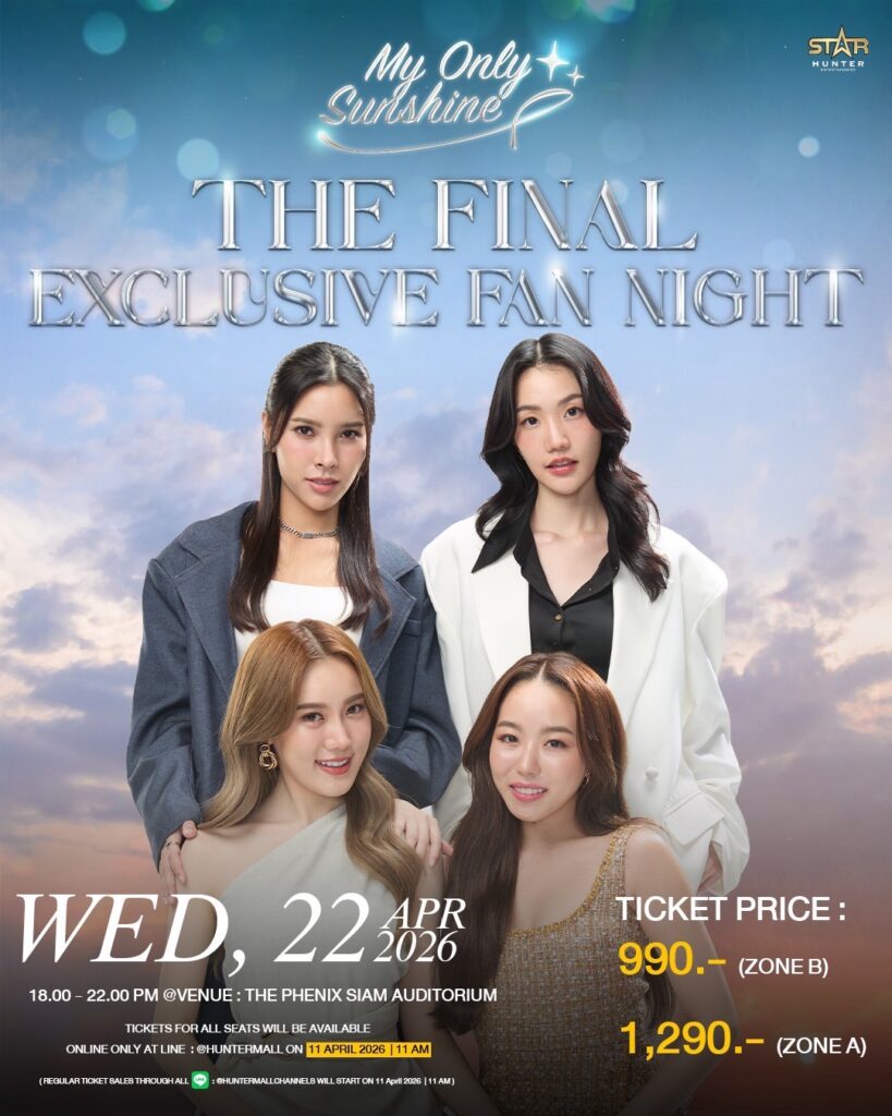 วอร์มนิ้ว! ล็อคเวลากดบัตร มีจำนวนจำกัด แล้วมาร่วมลุ้นบทสรุปความรักของคนทั้งคู่ไปด้วยกัน กับงาน “My Only Sunshine : The Final Exclusive Fan Night” ในวันพุธที่ 22 เมษายน 2569 เวลา 18.00 – 22.00 น. ณ The Phenix Siam Auditorium โอกาสสุดท้ายที่จะได้ฟินพร้อมกันแบบจอยักษ์มาถึงแล้ว!