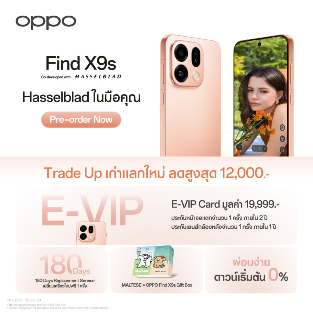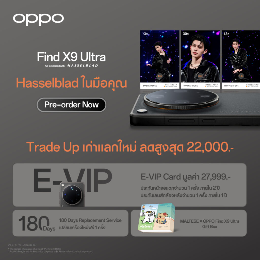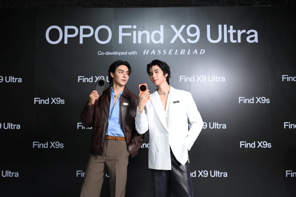 (กรุงเทพฯ – 23 เมษายน 2569) กลายเป็นไวรัลสนั่นโซเชียลทันทีเมื่อเหล่าซุปตาร์ตัวท็อป และไอคอนคนรุ่นใหม่ตบเท้าร่วมสาดออร่าที่งานเปิดตัวสมาร์ตโฟนแฟลกชิปที่สุดแห่งปี ในค่ำคืนของ Ultra Imaging Night OPPO Find X9 Ultra | OPPO Find X9s นำทัพโดยคู่พ่อ-ลูกตัวฮอตของวงการ ‘ปอนด์ ณราวิชญ์ – น้องเพิ่มพูน’ และนางเอกสาวดาเมจแรง ‘เบ็คกี้ รีเบคก้า’ ร่วมด้วย 2 หนุ่มเทสดี ‘พีช พชร – ไอซ์ซึ ณัฐรัตน์’ ประชันความหล่อกับคู่ซี้ห้างแตก ‘จุง อาเชน – ดัง ณัฎฐ์ฐชัย’ มาพิสูจน์กันว่ากล้องระดับอัลตราของจริง ซูมจึ้งจนตาแตก ภาพและวิดีโอสีสันสวยเป็นธรรมชาติ คมชัดแบบมืออาชีพ พร้อมด้วยหูฟังไร้สายรุ่นใหม่ OPPO Enco Clip2, OPPO Enco Air5 Pro และสมาร์ตวอทช์ OPPO Watch X3 เพื่อเติมเต็มอีโคซิสเต็ม