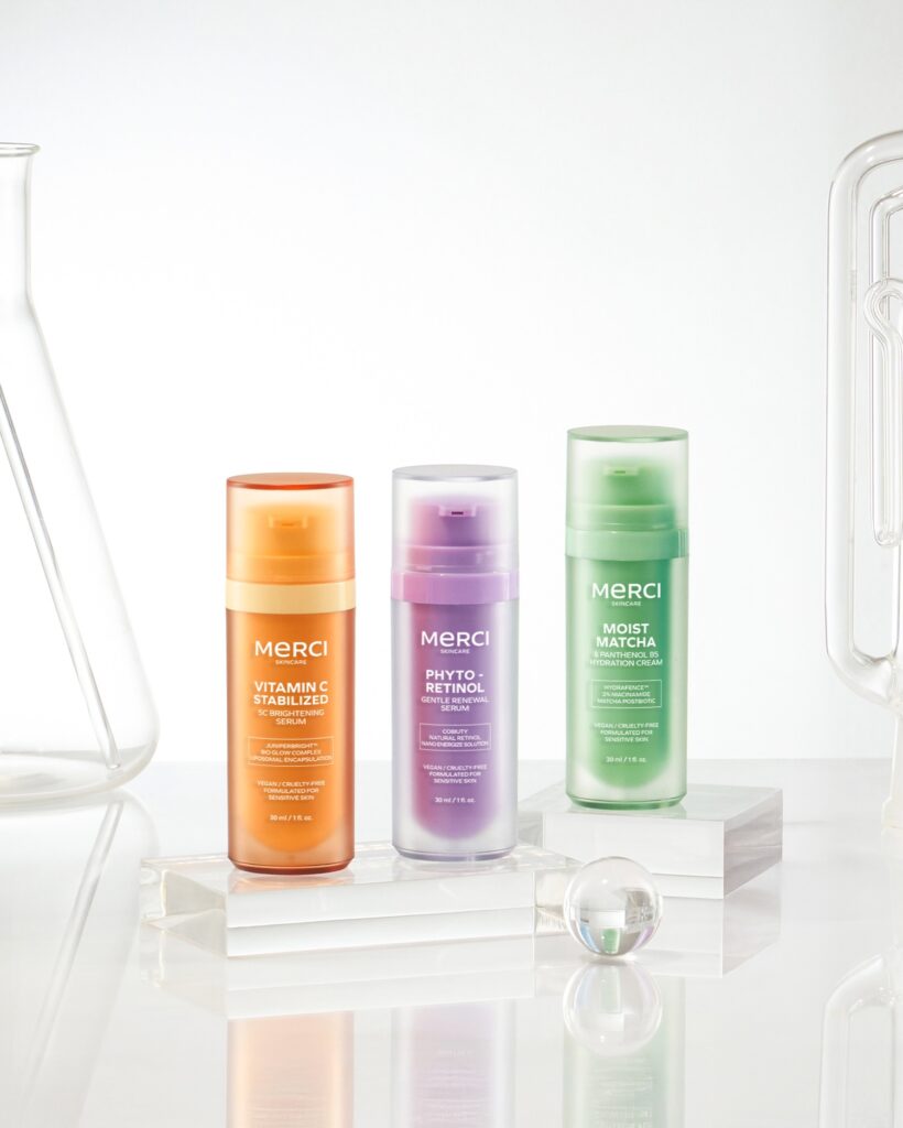 Merci Skincare กลุ่ม Lab-Proven & Gentle Formula Series มีผลิตภัณฑ์หลัก 3 สูตร ครอบคลุมปัญหาผิวสำคัญ ได้แก่ สูตรมอยส์เจอไรเซอร์ ช่วยเติมและกระจายความชุ่มชื้นพร้อมเสริมเกราะป้องกันผิวให้แข็งแรงจากสารสกัดมัทฉะ แบรนด์แรกในไทย ,สูตรวิตามินซี 5 ชนิดความเสถียรสูง ออกแบบมาเพื่อช่วยดูแลความกระจ่างใสอย่างอ่อนโยนสำหรับผิวแพ้ง่ายและสูตรเรตินอล จากธรรมชาติ มุ่งดูแลริ้วรอยก่อนวัย โดยลดความกังวลเรื่องการระคายเคืองให้มากที่สุด โดยผลิตภัณฑ์อยู่ในช่วงราคา 490–790 บาท และวางจำหน่ายผ่านช่องทางออนไลน์อย่าง Shopee, Lazada, Konvy รวมถึงช่องทางออฟไลน์ เช่น Watsons, Eveandboy, Beautrium และ 7-Eleven ในรูปแบบซอง เพื่อให้ผู้บริโภคเข้าถึงได้สะดวกยิ่งขึ้น